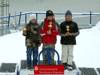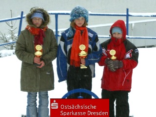 Der Starthöhenwechsel, zuerst eine sehr schnelle Bahn, dann heftiger Schneefall, all das stellte hohe Anforderungen an die Rodler der Jugend D, die mit dem Sparkassenpokal den ersten Rodelwettbewerb im Jahr 2008 austrugen. Mit viel Einsatz bewältigten die Starter von der Kurve 10 und 11 ihre Aufgaben. Einen Zwickauer Dreifacherfolg gab es durch Tim Jungheinrich, Maximilian Illmann und Tim Goßpietsch. Die Plätze 4, 5 und 6 belegten Stephan Kluge (BAU), Lucas Geyer (ZWI) und Dominic Schulze (DRE). Bei den Mädchen gewann Jessica Tiebel (ABG) vor Nadine Wroblewski (BAU) und Josephine Meitzner (DRE). Die weiteren Plätze belegten Johanna Meitzner (DRE), Jana Jung (ABG) und Laila-Mariella Poley (ZWI). Text: K.Schwabe - Fotos: K.Schwabe | |||||||||||||||||||||||||||||||||||||||||||||||||||||||||||||||||||